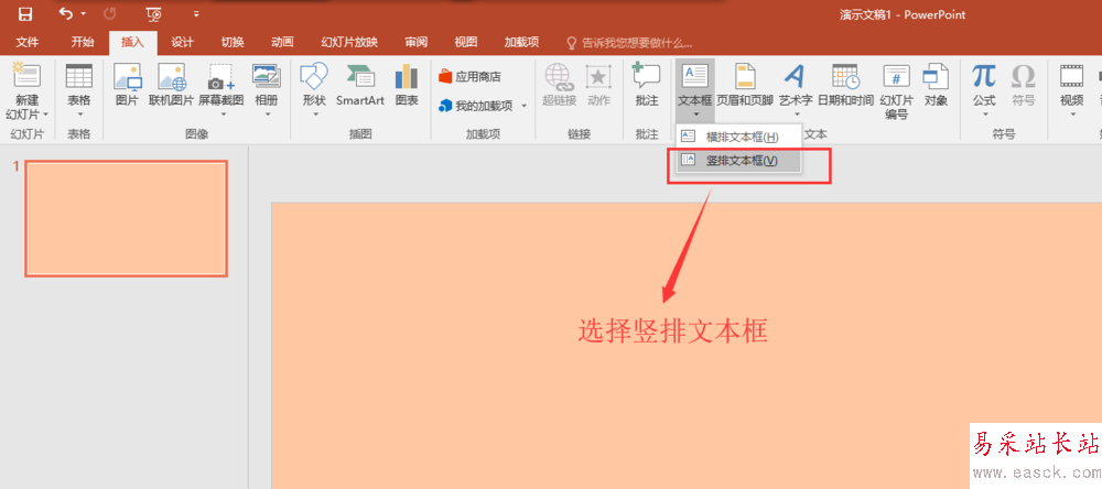 2、在插入菜單欄中找到文本框工具,點開文本框工具在其中選擇豎排文本框;然后在幻燈片頁上插入一個豎排文本框,并在其中輸入文本內容。