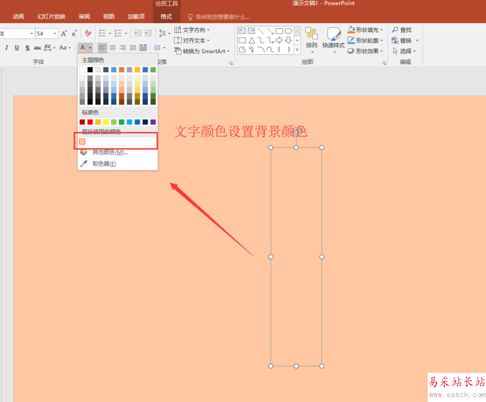 3、選中整個文本框或者是選中文本框中的全部文字,在開始菜單中設置文字的顏色,在這里將文字的顏色設置與幻燈片背景的顏色一致,這樣文字就看不見了。