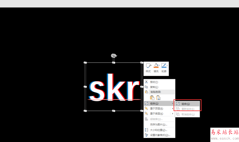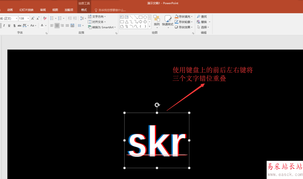 6、分別選中復制的兩個文本框,將兩個文本框的文本內容的顏色改為紅色與白色;然后分別按鍵盤上的上下左右鍵移動這兩個復制的文本框,使其與原來的文本框錯開重疊擺放;然后拖動鼠標選中這三個文本框,右鍵將其組合。這樣,我們就在PPT中做成了一個多顏色的重疊文字。