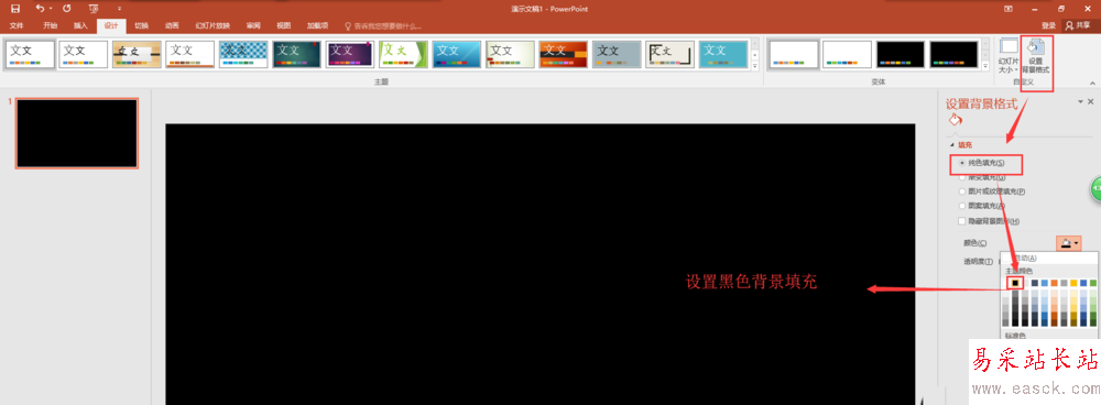 2、選擇設計菜單欄,在設計菜單欄中找到并執行“設置背景格式”命令,然后在設置背景格式窗口中選擇純色填充,將幻燈片頁的背景設置為黑色,這樣方便我們觀察文字效果。