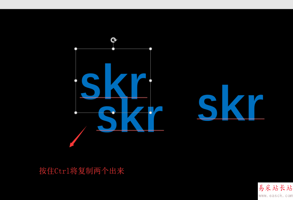 5、選中插入的文本框,按住鍵盤上的輔助鍵Ctrl鍵,移動并復制文本框,執行兩次操作,得到兩個復制出來的相同的文本框內容。