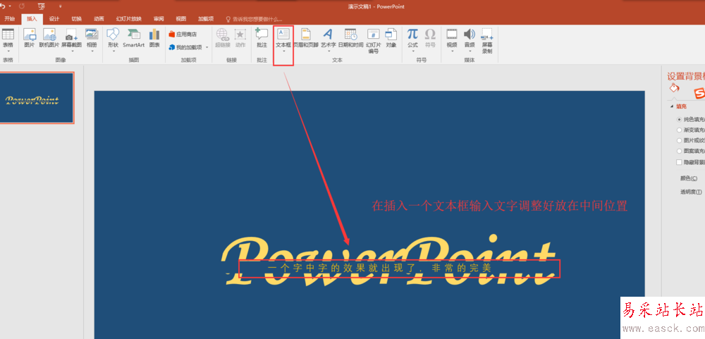 7、在插入一個文本框,輸入相應的文字,調整好文字屬性,將其移動到減去的大文本框的中間空余位置上。這樣,在PPT 2016中就完成了一個字中字的效果。