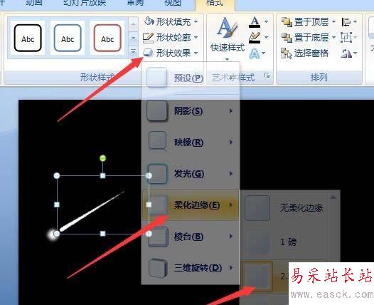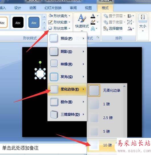 5、再點(diǎn)擊格式選項(xiàng)卡,點(diǎn)擊形狀效果,柔化邊緣,2.5磅。