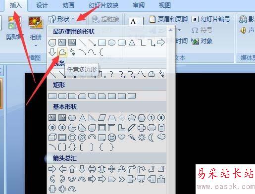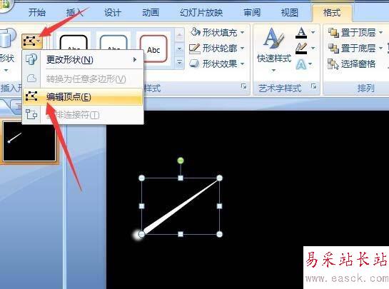 4、再點(diǎn)擊插入形狀,選擇任意多邊形。點(diǎn)擊格式選項(xiàng)卡,點(diǎn)擊編輯頂點(diǎn),修改形狀如圖所示。