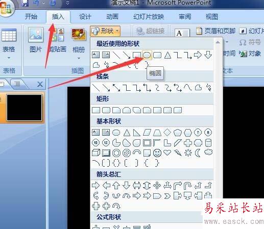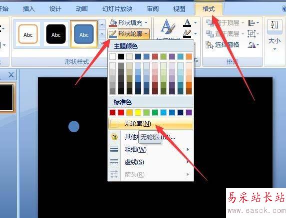 2、接下來點(diǎn)擊插入選項(xiàng)卡,點(diǎn)擊形狀,再點(diǎn)擊橢圓,繪制出一個(gè)圓形。再點(diǎn)擊格式選項(xiàng)卡,點(diǎn)擊形狀輪廓,選擇無輪廓。