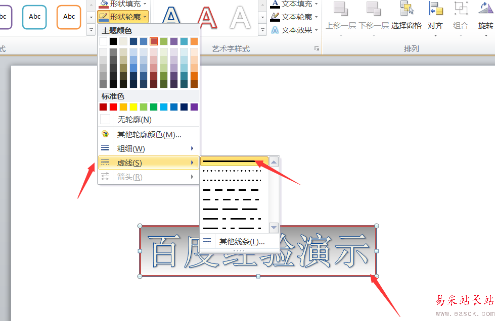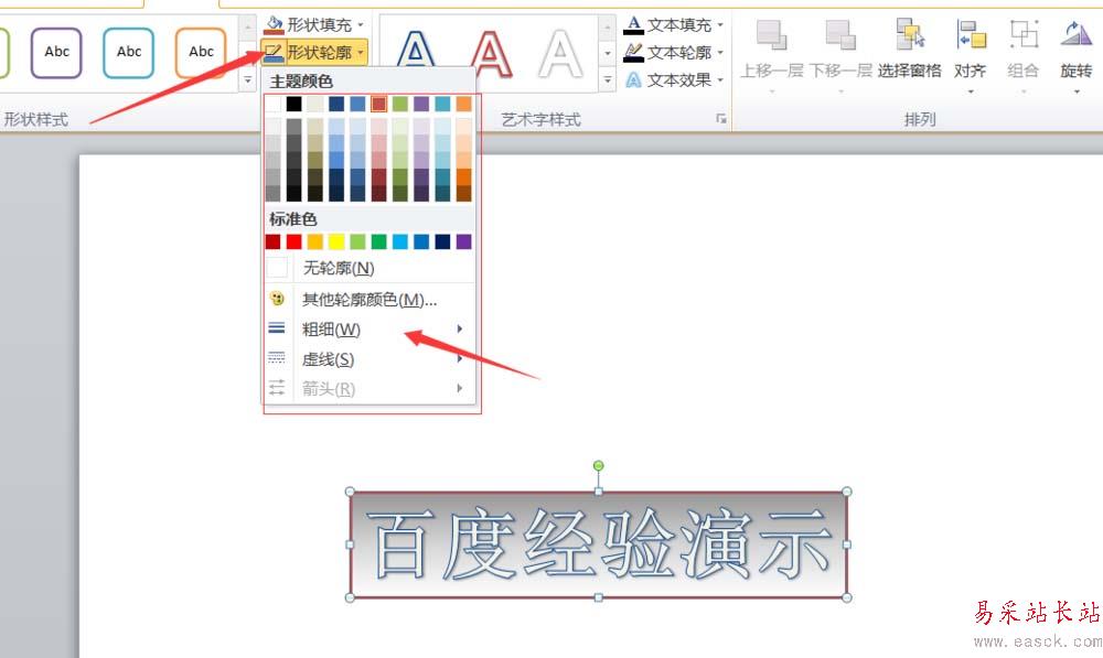 5、再接著我們?cè)O(shè)置形狀輪廓,形狀輪廓一般是指整個(gè)輪廓的顏色,也可以調(diào)整個(gè)輪廓的粗細(xì)和線條樣式,如下圖所示。