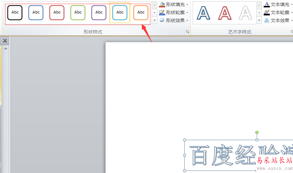3、我們插入一個(gè)藝術(shù)字之后,然后雙擊一個(gè)藝術(shù)字,就可以出現(xiàn)上面的候選欄,有形狀樣式,形狀填充,形狀輪廓,形狀效果等。如下圖所示。