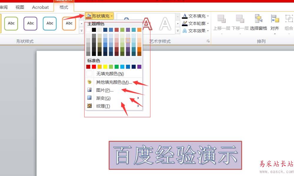 4、首先,我們?cè)O(shè)置形狀填充,形狀填充可以設(shè)置為填充顏色,也可以設(shè)置為圖片,漸變和紋理等。如下圖所示,小編設(shè)置了一個(gè)填充顏色。