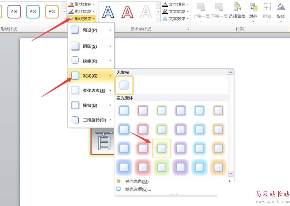 6、再接著我們可以設(shè)置整個(gè)藝術(shù)字的形狀效果,形狀效果可以設(shè)置為陰影,印象,發(fā)光等各種各樣的樣式,大家以自己的喜好進(jìn)行設(shè)置。如下圖所示。