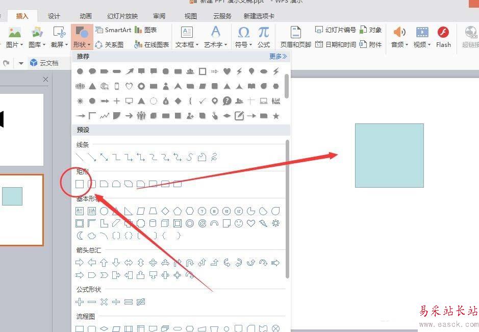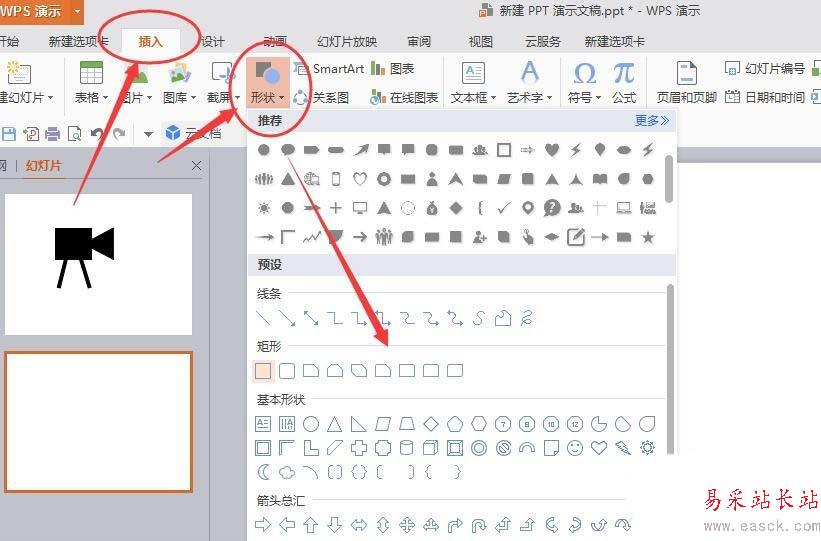 1、新建一張PPT,點開菜單欄里面的插入,點開形狀,選擇一個矩形