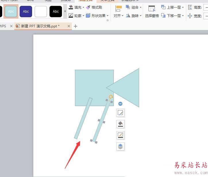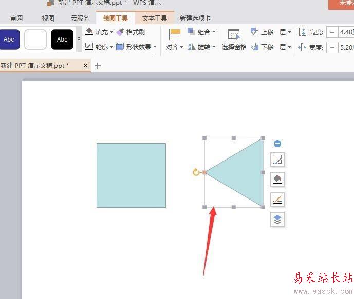 4、將三角形向左旋轉90°之后,把它移到四方形接合