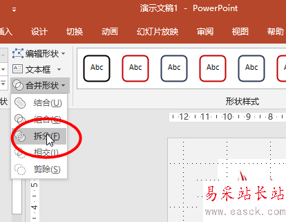4、同時選擇正方形和文字,接著點擊“格式-合并形狀-拆分”