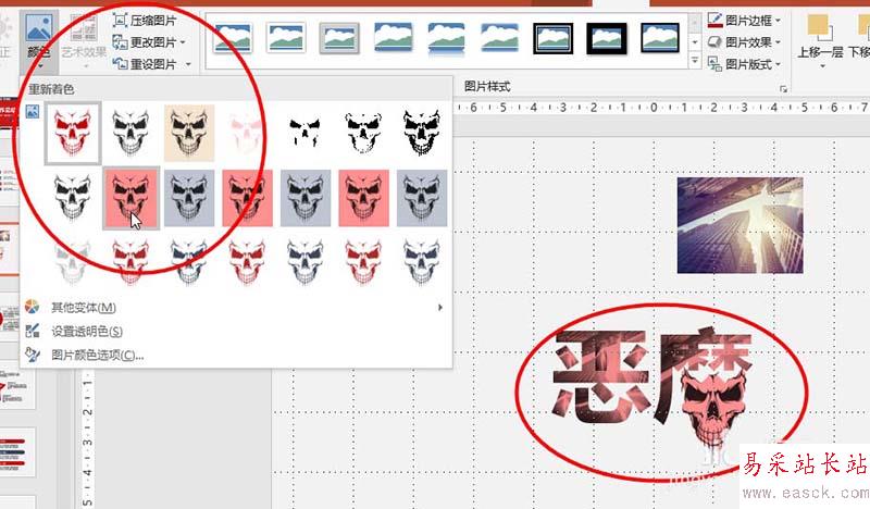 6、然后再將要合并的圖片調整大小,拖動到相應的位置,然后點擊“格式-顏色”,調整整體的顏色即可