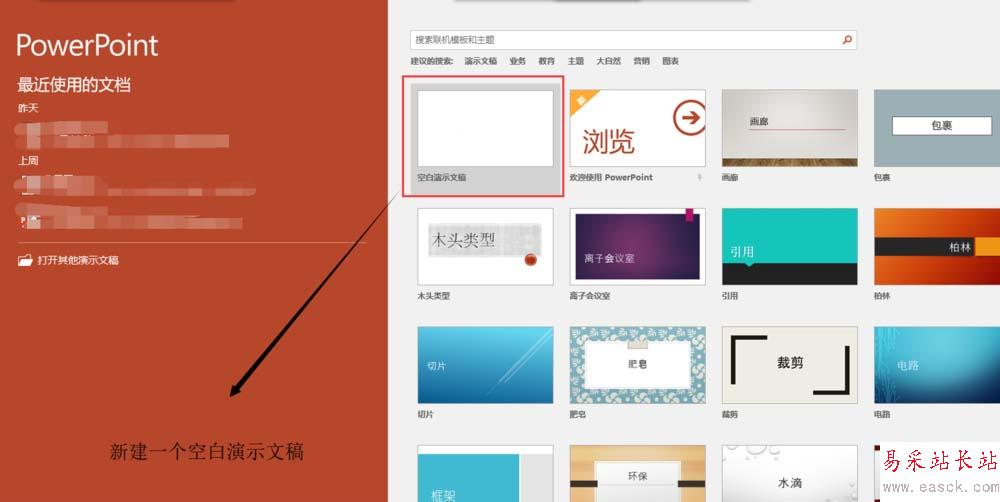2、打開PPT 2016演示文稿軟件,新建一個空白的演示文稿,將新建的演示文稿的板式設置為空白板式。