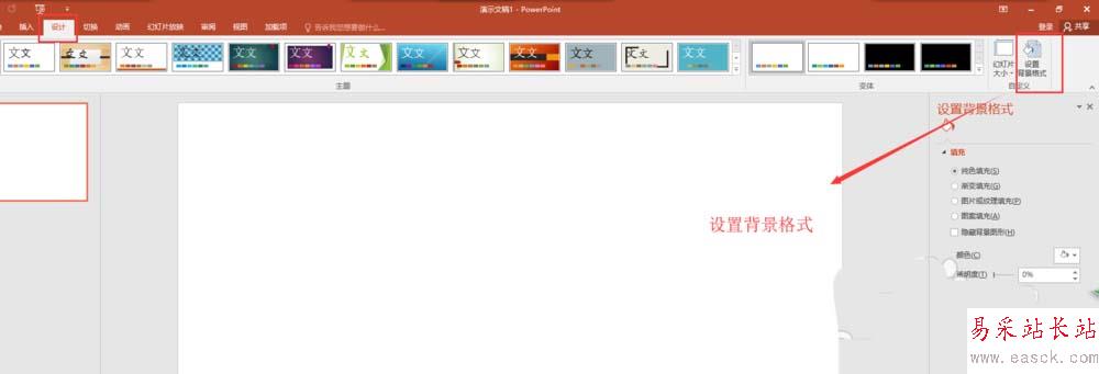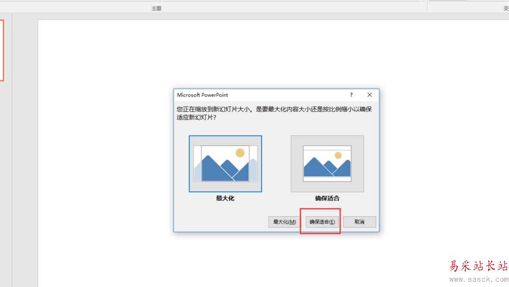 3、設置好演示文稿的板式之后,我們接下來要設置幻燈片頁的大小,因為你不論在做什么海報之前,你肯定都需要先確定海報的大小,所以我們切換到“設計”菜單,找到幻燈片大小設置,選擇標準4:3的大小設置,在彈出的窗口中選擇確保合適。