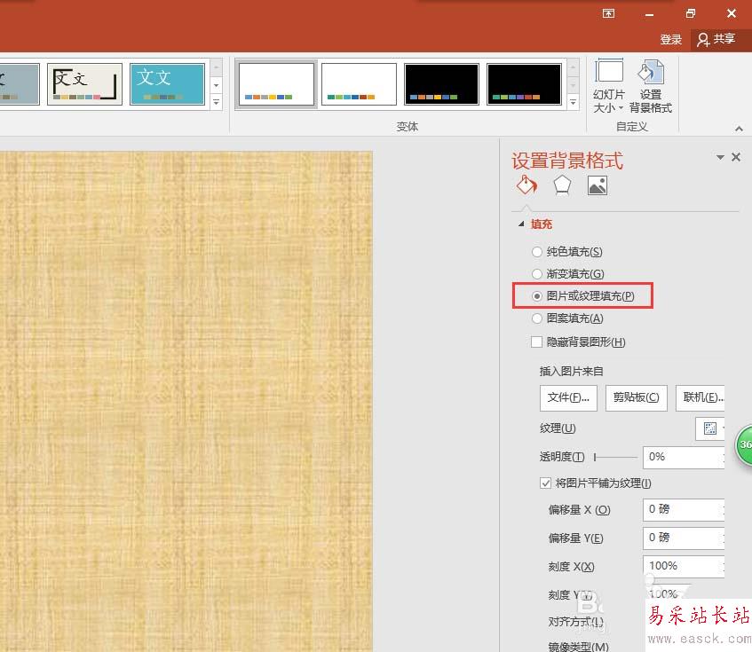 4、在設計菜單中找到設置背景格式命令,會在幻燈片的右側彈出一個設置背景格式的窗口,在背景設置中選擇圖片或紋理填充,在圖片與紋理填充的下方點擊來自文件,在彈出的文件窗口中找到并選中我們之前找到下載的圖片素材,點擊插入進行導入。