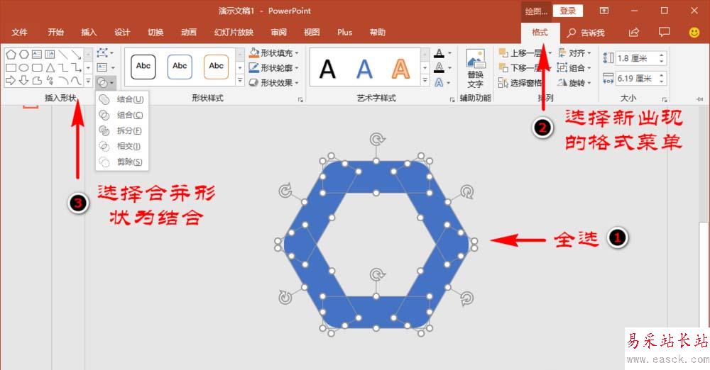 8、如果,我們不想整個整體的正五邊形或正六邊形是空心的,我們可以再次通過插入形狀,插入一個正五邊形或正六邊形,覆蓋住這個空心,最后再次執(zhí)行“合并形狀”中的“結(jié)合”,將兩者結(jié)合為一個整體。到此,我們就順利完成了一個圓角正五邊形或正六邊形的繪制了,通過設置其形狀格式,我們可以為其添加其他填充和其他線條顏色。