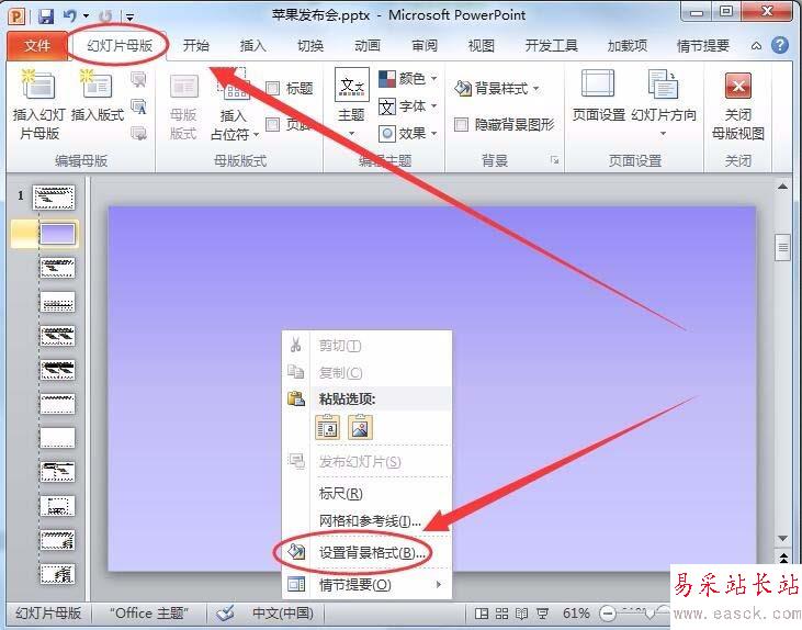 1、幻燈片母版中,在幻燈片上右擊,選擇設置背景格式。