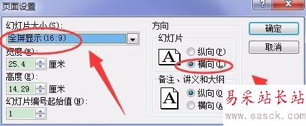2、頁面設置窗口中,幻燈片大小選擇16:9,幻燈片方向選擇橫向。