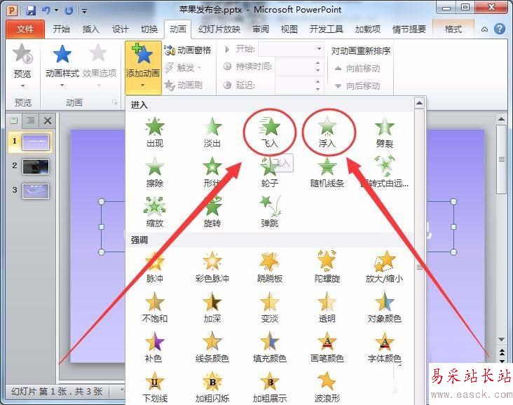 2、選擇飛入、浮入等簡潔的動畫,切勿濫用動畫。