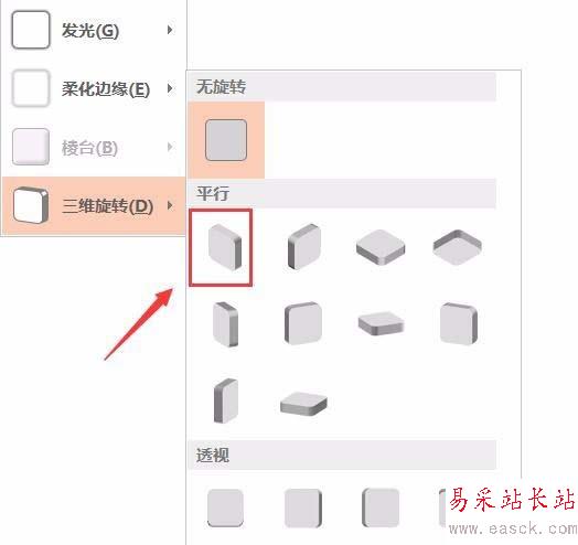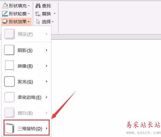 5、點擊無填充顏色之后我們再在格式里找到形狀效果選項,點擊該選項在其下拉列表里找到三維旋轉選項,如圖所示: