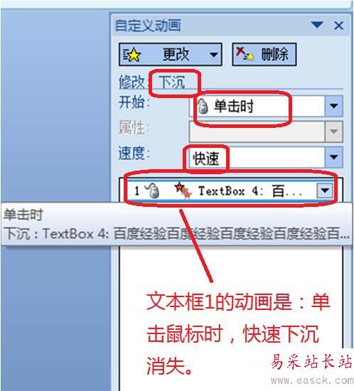 3、設置好的第一個文本框的動畫是:單擊鼠標后,文本框一就會快速下沉消失。
