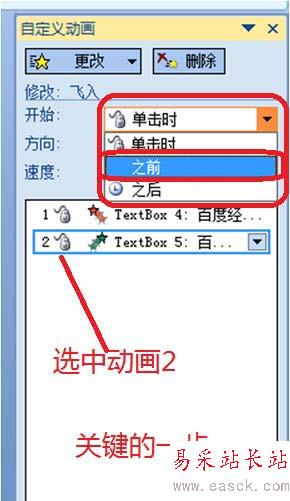 2、比較關鍵的一步就是設置第一個文本框消失,同時第二個文本框進入。這一步實際上就是設置第二個文本框出現的時間。選中動畫效果2,然后點擊“單擊時”右側的小箭頭,在下拉框里滑動光標選中“之前”。