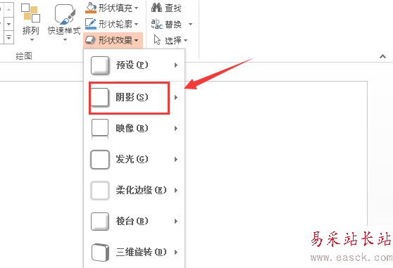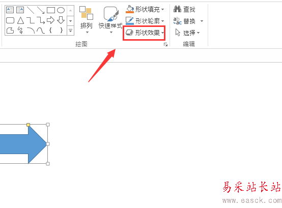 3、選擇畫出的箭頭再在繪圖里找到形狀效果選項,如圖所示: