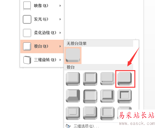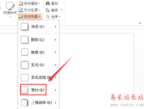 4、點擊形狀效果選項在其子級菜單里找到棱臺選項,如圖所示: