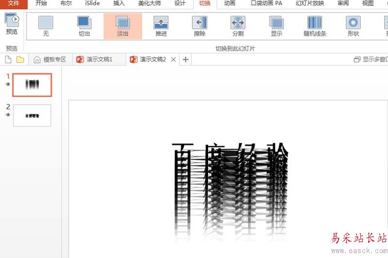 7、選擇第一頁幻燈片,執行切換-淡出命令,播放查看效果。
