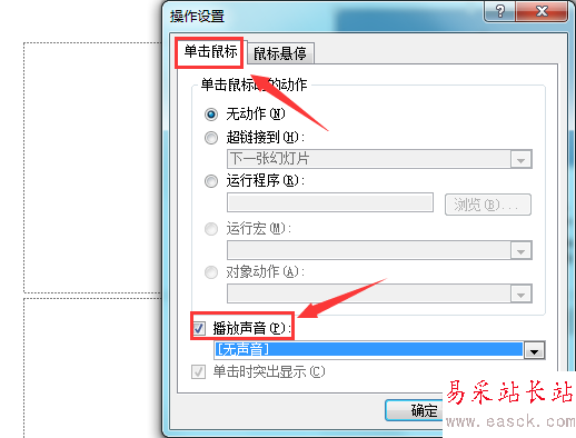 5、在操作設置對話框內我們點擊單擊鼠標選項,并在其內找到播放聲音選項,如圖所示: