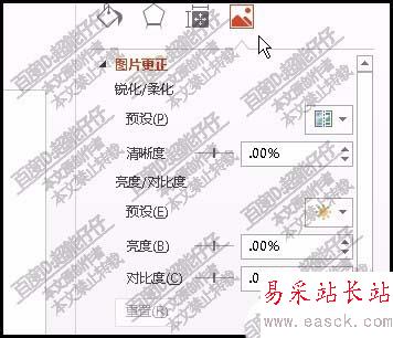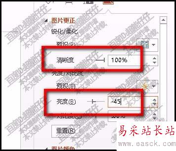 5、在圖片更正這里,把清晰度設(shè)置為100,對(duì)比度設(shè)置為-45
