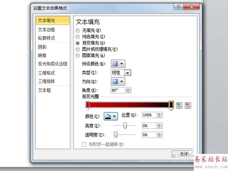 4、設置文本填充為漸變填充,漸變光圈為紅色到黑色。