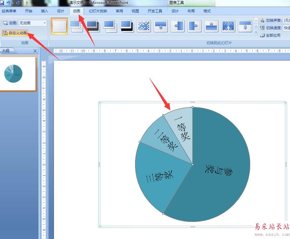 6、例如下面的圖片中,餅圖里分別輸入了一等獎、二等獎、三等獎和參與獎。文本的位置要自己拖動設置,并旋轉文本以適應餅圖。文本設置好后,選中餅圖,再選擇動畫,點擊自定義動畫。