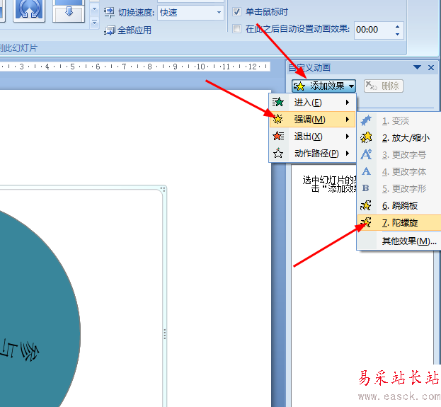 7、在右邊點擊添加效果,選擇強調里的陀螺旋。