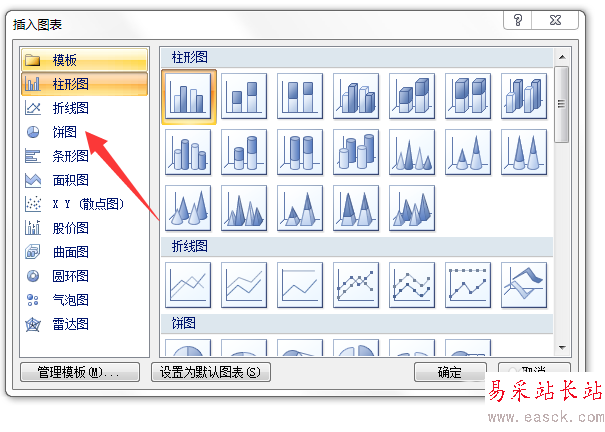 2、選擇餅圖,用第一種餅圖,點擊確定插入。