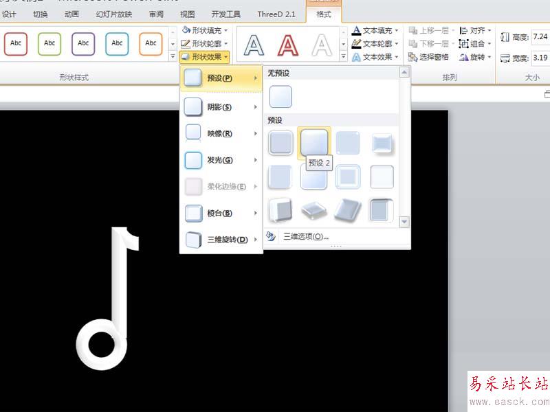 7、選擇圖形,執行格式-形狀效果-預設命令,選擇預設2,查看效果。