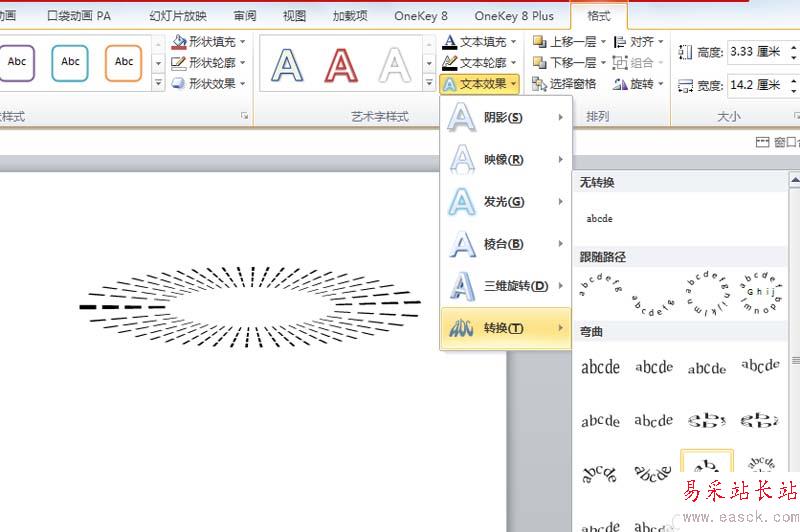 3、選擇文本框,執行格式-文本效果命令,接著選擇轉換里面的圓形。