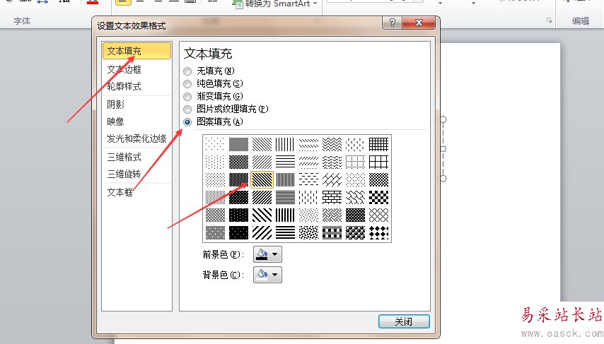 6、右鍵單擊另一個文本,選擇“設置文字效果格式”,文本填充選擇“圖案填充”。如圖: