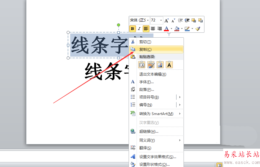 3、設置“線條字體”的大小和粗細。這里選用字號72號,宋體字,加粗。