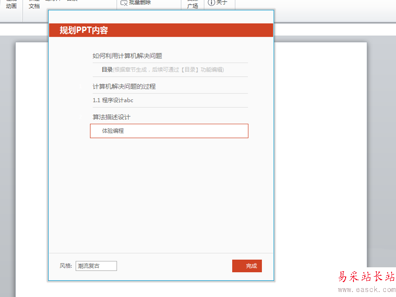 2、在彈出的規劃ppt內容對話框中,依次輸入目標和章節內容,風格選擇潮流復古,點擊完成按鈕。