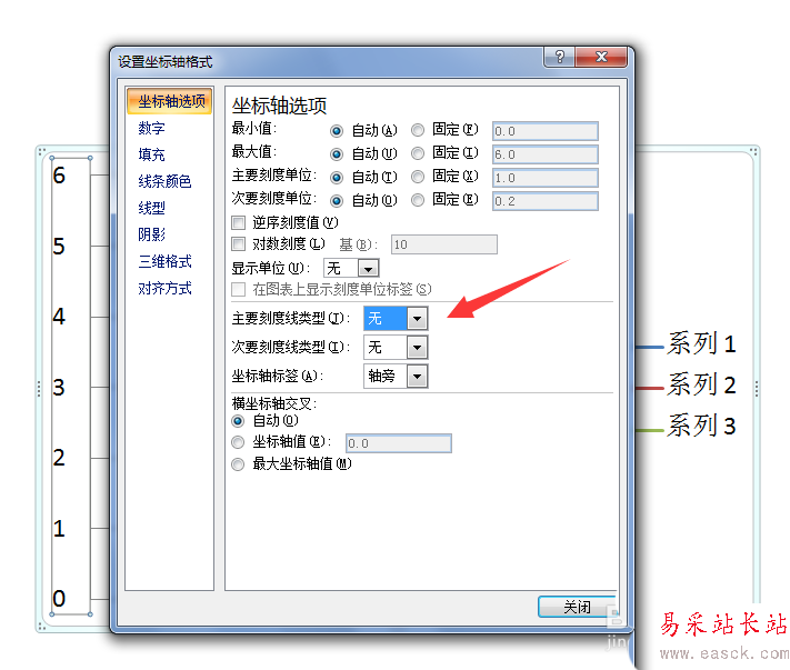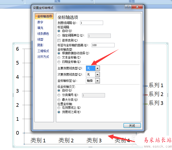 3、主要刻度類型選擇無,這時(shí)可以看到橫坐標(biāo)上的刻度已經(jīng)消失了。