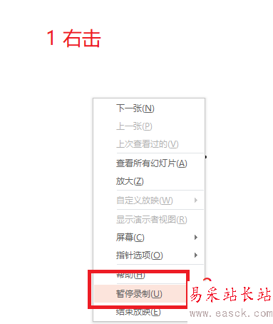 4、或者你也可以在幻燈片空白處【右擊】,選擇【暫停錄制】。