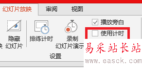 6、如果你不想它自己切換幻燈片,在設置選項組里將使用計時前面的【√】去掉即可。