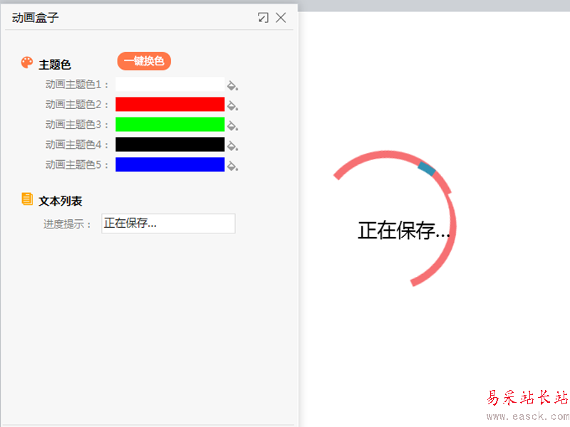 3、在動畫盒子對話框中,修改自己喜歡的動畫主題顏色,并修改文本列表中的進度提示內容為正在保存。