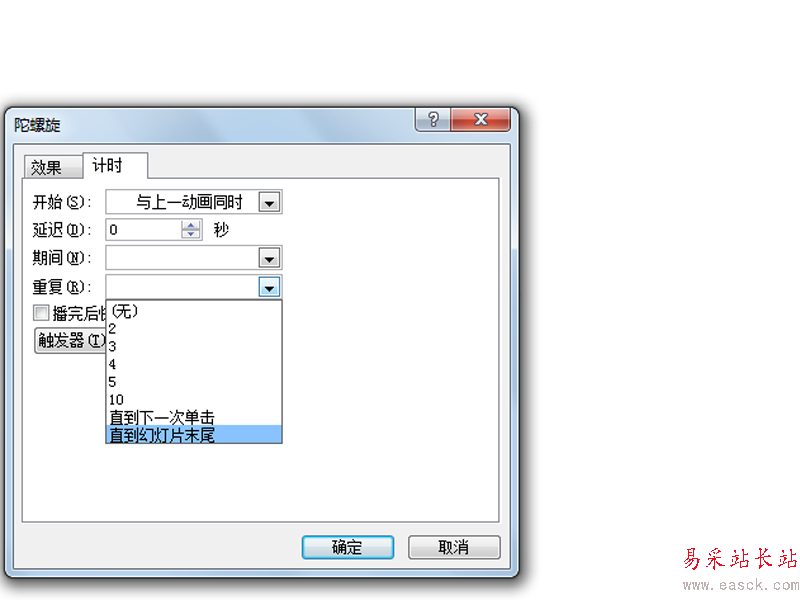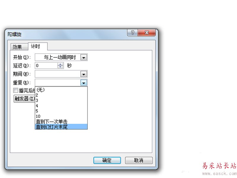 4、執行動畫-動畫窗格命令,選擇所有的動畫,調出計時選項卡,設置重復為直到幻燈片末尾。