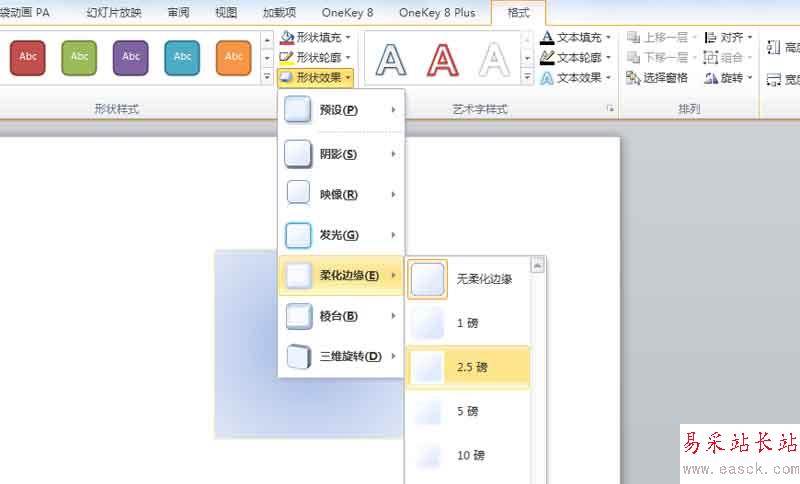 2、設置形狀填充為自己喜歡的一種漸變顏色,形狀輪廓為黃色,形狀效果為柔化邊緣2.5磅。