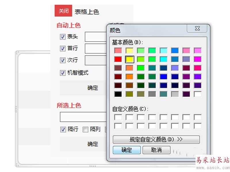 4、勾選表頭,右鍵單擊彈出顏色對話框,從中選擇自己喜歡的顏色,這里我們選擇黃色。