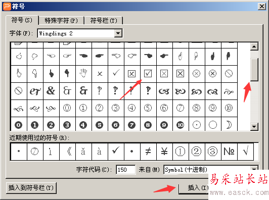 5、鼠標拖動右側的邊框,下拉,如圖中箭頭所示,選中我們需要的帶邊框的對號。點擊插入。