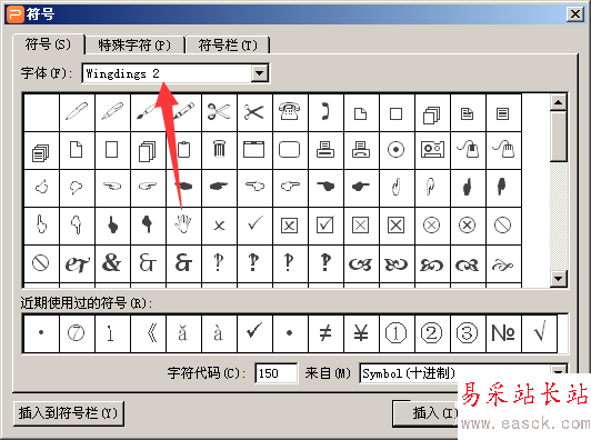 4、在“符號”頁面內,把字體調換到“Wingding2”.